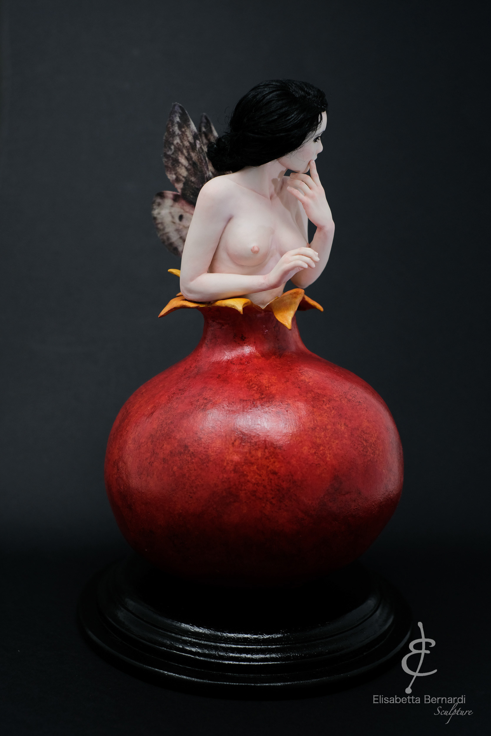 “Daria” è una OOAK in argilla polimerica con armatura metallica interna, ho realizzato ogni singolo dettaglio occhi compresi senza l’utilizzo di stampi. I capelli sono in lana tibetana mentre le ciglia sono in sintetico applicate una ad una. La pelle è dipinta con colori ad olio Genesis, la melagrana è modellata in polimerica e dipinta con colori acrilici; le ali sono stampate su carta di gelso protette da un trattamento con fimo liquido. La base è in legno dipinto con colori acrilici. L’altezza della bambola è di circa 19,5 cm. Ha un certificato di autenticità "Daria" is a polymer clay OOAK with internal metal armor, I made every single detail including eyes without the use of molds. The hair is in Tibetan wool while the lashes are in synthetic applied one by one. The skin is painted with Genesis oil paints, the pomegranate is modeled in polymer clay and painted with acrylic colors; the wings are printed on mulberry paper protected by a treatment with Fimo liquid. The base is in wood painted with acrylic colors. The height of the doll is approximately 19.5 cm. She have a certificate of Authenticity